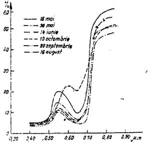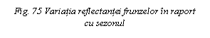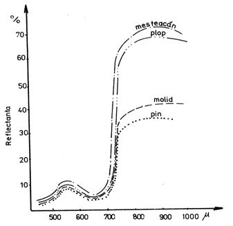 Intrucat frunzele diferitelor specii arborescente se diferentiaza intre ele sub diferite raporturi, care influenteaza valoarea reflectantei ca: dispozitia si compozitia cloroplastelor, structura anatomica a parenchimului, netezimea suprafetei, rezulta ca se va diferentia si reflectanta spectrala. (fig. 73, 74, 75)