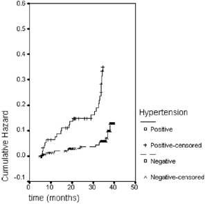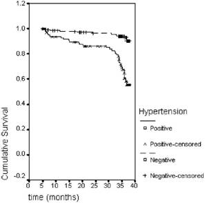 În timpul acestei perioade, 34 de pacienti au decedat datorita unor cauze nelegate de afectiunea valvulara si 18 datorita complicatiilor datorate afectiunilor valvulare (insuficienta cardiaca in 10 cazuri, ischemie acuta in 4, moarte subita in 3, si un caz de infarct miocardic). Figura 1. raporteaza supravietuirea estimata calculata pentru pacientii hipertensivi vs. cei nehipertensivi. La 35 de luni, pacientii hipertensivi au avut o supravietuire estimata la aproximativ 60%, iar cei nehipertensivi au avut o supravietuire estimata la 95%.