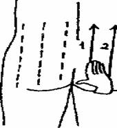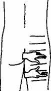 -pe partea posterioara a articulatiei se face mai intai netezirea cu partea cubitala a mainii -pe plica fesiera, dupa care incepem frictiunea deget peste deget din interior spre exterior pe plica fesiera, pana catre creasta iliaca, avand grija sa o repetam in jurul trohanterului mare.Pe muschii fesieri se face frictiunea cu pumnul sau