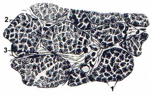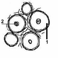 Fig. 4 Tesut muscular striat, sectiune transversala. (schema generala) Fibrele musculare sectionate transversal apar sub forma de campuri citoplasmatice acidofile, poligonale, cu 2-3 nuclei rotunzi situati sub membrana sau fara nuclei , tn functie de nivelul sectionarii.La unele fibre musculare se disting grupari de puncte fine, numite campuri Cohnheim.Intre fibre se gaseste tesut conjunctiv lax.
