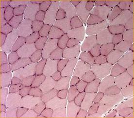 Fig. 5 Muschi striat, sectiune transversala, coloratie H.E., ob X20. Fibrele musculare sectionate transversal apar sub forma unor campuri citoplasmatice acidofile, poligonale cu 2-3 nuclei rotunzi situati sub membrana , sau fara nuclei in functie de nivelul sectionarii. Intre fibre se gaseste tesut conjunctiv lax. Coloratia diferita a fibrelor indica diferenta de metabolism dintre acestea