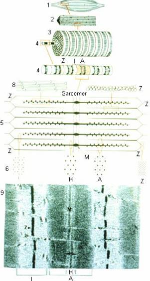 Fig. 8 Organizarea muschiului striat scheletic (1). fascicul muscular :2., fibra musculara: 3 ,miofibrila: 4 ,sarcomer: 5 6. analiza cupelor transversale la nivelul sarcomerului,9 : sarcomer la microscopul electronic,7 - filamente fine de actina, 8 -filamente de miozina.