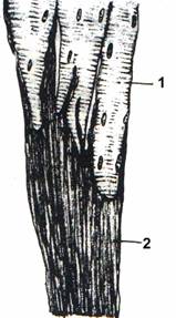 Fig. 9 Legatura muschi -tendon. (schema generala) Se observa cum fibrele conjunctive tendinoase, sunt in raport de contiguitate cu fibrele musculare striatesi in raport de continuitate cu sarcolema.Tesutul conjunctiv care constituie peritenoniul este in raport de continuitate cu tesutul conjunctiv care alcatuieste perimisiumul si endomisiumul.