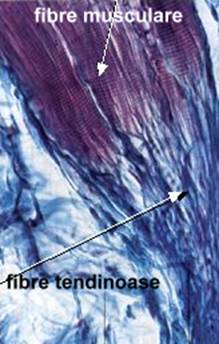 Legatura solida muschi tendon se realizeaza prin fibrele tendinoase, care sunt in raport de contiguitate cu plasmalema ce delimiteaza sarcoplasma si miofibrilele si in raport de continuitate cu sarcolema.