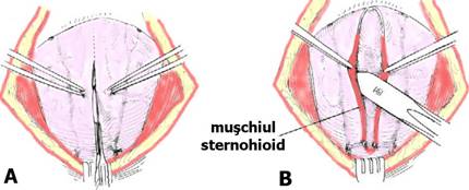 Fig. 10 - Izolarea (A) si sectionarea (B) istmului tiroidian (dupa Zollinger) (6)