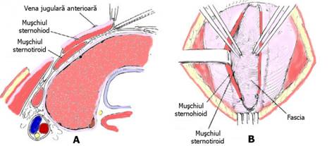 Fig. 5 - A. Expunerea glandei tiroide; B. Incizia fasciei peritiroidiene (dupa Zollinger) (6)