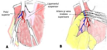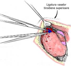 Ligatura si sectiunea ramurilor arterei tiroidiene superioare permit enucleerea polului superior tiroidian si exteriorizarea partiala sau completa a lobului. Ligatura se poate realiza in doua moduri: