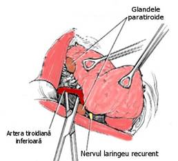 disectia si eliberarea polului inferior, cu ligatura venelor tiroidiene inferioare;