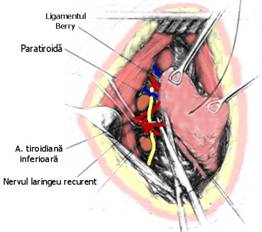 raporturile marginii postero- interne a lobului tiroidian cu glandele paratiroide si nervul recurent;