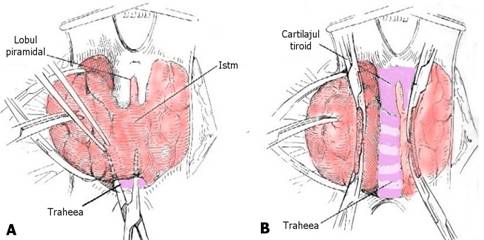 O pensa similara este inserata la partea superioara a glandei. Dupa ce este realizat planul de clivaj dintre istm si trahee, istmul este sectionat intre pensele curbe. Aceste pense nu trebuie sa patrunda in fascia traheala. Pensele raman pe partea stanga a istmului, iar marginea dreapta este trasa in lateral. Se aplica pense curbe fine pe parenchimul glandular, dincolo de trahee, indreptate in directia celor deja montate pe fata laterala a lobului inferior.