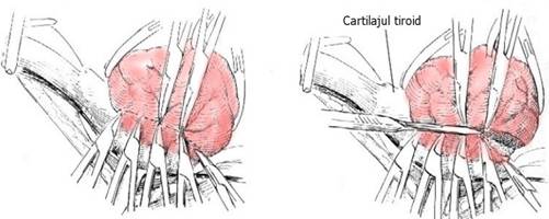 sectiunea trebuie efectuata superior, la nivelul cartilajului cricoid, pentru a evita lezarea ramului descendent al nervului XII, care abordeaza acesti muschi in partea inferioara;
