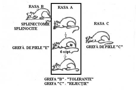 Soarecii din rasa A au fost inoculati in perioada neonatala cu celule splenice vii recoltate de la animalele adulte de rasa B. Dupa ce au devenit adulti, soarecii A au primit grefa de piele prelevata de la un soarece de rasa B. Grefa 'B' a fost tolerata, in schimb o grefa recoltata de la soarecii de alta rasa (C) a fost respinsa. (Fig.58)