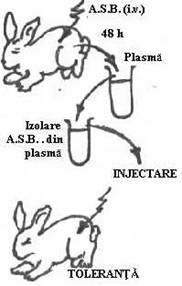 FREI, THORBECKE si BENACERRAF (1963) au imunizat iepuri cu albumina serica bovina (ASB), administrata i.v.. Dupa doua zile de la injectie au recoltat plasma de la iepure din care au izolat urme de ASB. Aceasta fractiune de ASB poseda capacitatea de a induce toleranta, pierzand in schimb proprietatile sale imunogenice native (Fig.59)