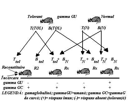 WEIGLE [i col. au ob]inut toleran] fa] de gamaglobulin uman (gamma GU) prin injectarea unor [oareci singenici cu forma 'dezagregat' (tolerogen) a gamma GU. Limfocitele T [i B izolate de la [oarecii toleran]i, impreun cu limfocitele T [i B preluate de la animalele martor au fost utilizate in diverse mixturi pentru reconstituirea unor animale iradiate. Toate loturile de animale reconstituite au primit cate o doz imunogen de gamma GU.