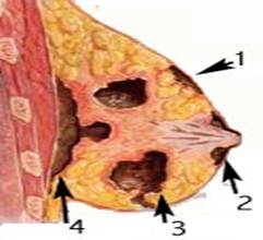 Fig.1 - Inflamatii acute ale sanului -abcese: 1-subcutanat, 2-periareolar, 3 - intraglandular fistulizat, 4- retromamar (dupa Netter) (5)
