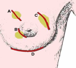 Fig. 2. Incizii folosite in mastitele acute: A. radiare; B. periareolare; C. circumferentiala; D. submamara