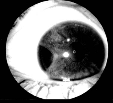 (pe traiect se observa plaga corneeana, gaura in iris,