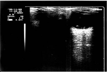 - examinarea ecografica realizata in ecografie tip A sau B, determina o localizare de precizie a corpului strain daca acesta are dimensiuni mai mari de 0,75mm (vezi plansa)