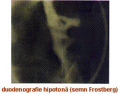 - duodenografie hipotona (varianta a examenului radiologic standard): prezinta imagini lacunare la nivelul DII, marirea potcoavei duodenale, aspectul de "3" inversat (semnul Frostberg) secundar aderentei dintre ampula si duoden, aparitia de spiculi tumorali pe marginea concava duodenului;