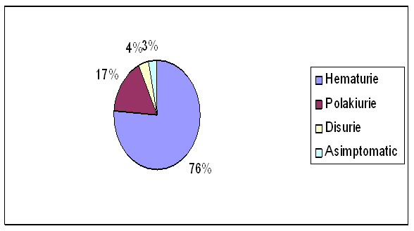 3. Cea mai frecventa forma de debut este reprezentata de hematuria, 76%, oricarui bolnav cu hematurie trebuie sa i se efectueze cistoscopie in anestezie, in conditii de spitalizare.