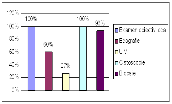 7. In cadrul protocolului de diagnostic al unei tumori vezicale superficiale, la un pacient cu simptomatologie sugestiva, principalele metode sunt reprezentate de tuseul rectal cu palpare bimanuala a hipogastrului sub anestezie cu miorelaxare, efectuat la toti pacientii lotului studiat si de cistoscopie cu o reusita in diagnostic de 100%, ambele impunandu-se cu caracter obligatoriu la orice pacient.