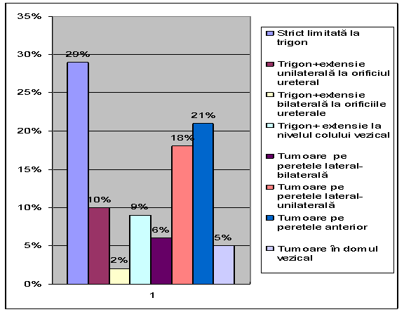 11. Localizarea tumorilor este preponderent limitata la trigon, 29%, tumori pe peretele anterior, 21%, iar tumorile cele mai putine au fost acelea care ating trigon si dau extensie bilaterala la orificiile ureterale, 2%.