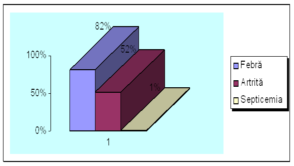 Semnele generale sunt reprezentate de febra, 82% (167 pacienti), artrita 52% (106 pacienti) si in cel mai rau caz, s-au prezentat pacienti cu detresa respiratorie, colaps cardio-vascular, hepatita, septicemia, 1% (21 pacienti cu septicemie) care poate fi fatala.