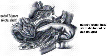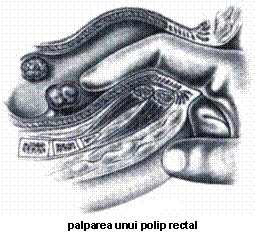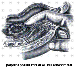 - la final, se cere bolnavului sa contracte musculatura abdominala (similar efortului de defecatie), gest care ofera posibilitatea explorarii a 2-3 cm suplimentari de rect (eventual, se realizeaza acest lucru in pozitia "stand pe vine" a bolnavului);