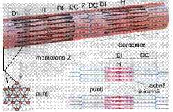 In centrul discului intunecat se afla o portiune mai luminoasa - banda H (Hensen), iar in centrul discului clar, o portiune mai intunecata -membrana Z. Doua membrane Z succesive delimiteaza un sarcomer-unitatea morfofunctionala a fibrei musculare.