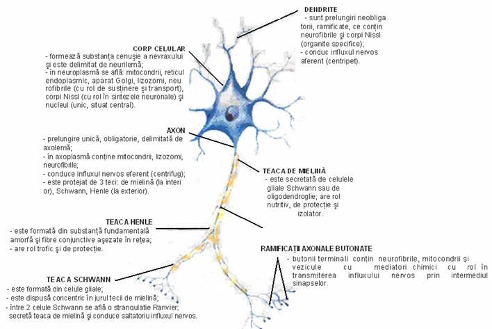 Neuronul reprezinta unitatea morfo-functionala a sistemului nervos. Din punctul de vedere al formei si al dimensiunilor, neuronii sunt foarte diferiti. Forma neuronilor este variabila: stelata (coarnele anterioare ale maduvei), sferica sau ovalara (in ganglionii spinali), piramidala (zonele motorii ale scoartei cerebrale) si fusiforma (in stratul profund al scoartei cerebrale).