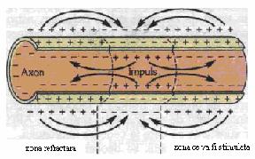 In conditii de repaus (cand nu actioneaza nici un stimul), neurilema este pozitiva pe fata externa si negativa pe cea interna. intre cele doua fete exista o diferenta de potential de 70 mV numita potential de repaus (se noteaza in mod conventional -70 mV). in timpul potentialului de repaus, membrana este permeabila pentru K+ si impermeabila pentru Na+. Aplicarea unui stimul cu intensitatea prag determina depolarizarea membranei datorita cresterii permeabilitatii ei pentru Na+. Membrana devine negativa la exterior si pozitiva la interior. Diferenta de potential devine 35 mV si se numeste potential de actiune. Acesta se autopropaga. (in mod conventional, se noteaza +35 mV.) Transmiterea depolarizarii de-a lungul fibrei nervoase constituie influxul nervos.