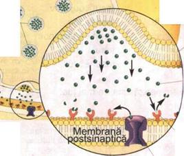 . sub actiunea impulsului nervos, se elibereaza cuante de mediator chimic in fanta sinaptica; . mediatorul chimic interactioneaza cu receptorii specifici de pe membrana postsinaptica, determinand modificari ale potentialului membranei postsinaptice. Conducerea este unidirectionala dinspre terminatia presinaptica spre cea postsinaptica. |