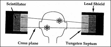 Camerele PET moderne contin un numr de 15.47 straturi transaxiale (Figura 8.23). Ecranul de plumb previne efecte parazite datorate pacientului iar firele de Tungsten elimin fotonii rezultati din efectul Compton de `mprstiere `n pacient. Datele sunt culese `n planuri transversale.