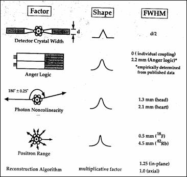 Rezolutia PET. Elementele care afecteaz rezolutia spatial a PET sunt prezentate `n Figura 8.24. Un prim factor este mrimea detectorului. De exemplu, pentru un bloc de cristale de scintilatie tip BGO scderea rezolutiei este de 2,2 mm. Exist o necoliniaritate `ntre directiile fotonilor de anihilare, care duce la micsorarea rezolutiei, proportional cu mrimea inelului detector. Un alt element este distanta dintre punctul de emisie al pozitronului si cel de anihilare. Rezolutia obtinut depinde de tipul radionucleului. Pentru 18F, rezolutia msurat la nivelul imaginii reconstruite este de 2,6 mm.