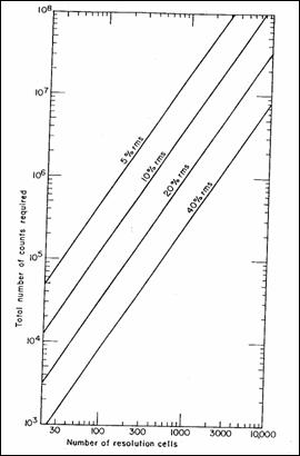 Cerintele de ordin statistic sunt legate direct de rezolutia spatial (Figura 8.25). Pentru o precizie (sau echivalent raport semnal/zgomot) dat si pentru o distributie uniform, numrul de evenimente cerut este liniar cresctor cu numrul de pixeli efectivi. Rezolutia efectiv este egal cu numrul de pixeli ocupati, ponderat cu activitatea aferent fiecrui pixel.