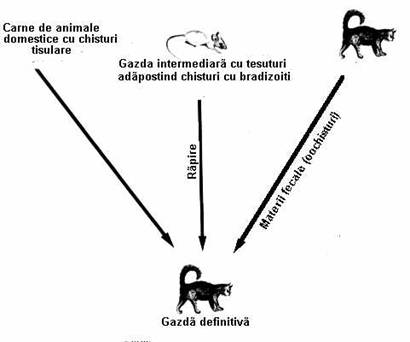 2) chisturile tisulare formate din bradizoiti (merozoiti sau cistozoiti), care determina o infectie latenta sau cronica si
