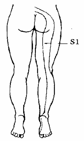 In caz de sciatica S1, durerea cuprinde partea posterioara a fesei, partea posterioara a coapsei si gambei, tendonul lui Achile, calcaiul si regiunea plantara.