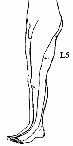 Simptomul preponderent uneori exclusiv il constituie durerea in regiunea lombara, durerea iradiaza in membrul inferior avand un traiect care depinde de radacina afectata astfel in sciatica L5 durerea intereseaza portiunea posterioara a fesei, fata posterioara a coapsei, fata externa a gambei, partea externa a gleznei, regiunea dorsala a piciorului ajungand uneori pana la haluce.