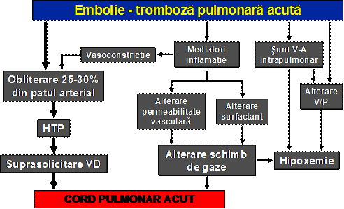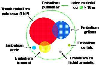 embolism pulmonar acut sau cronic (trombi, tesut tumoral, paraziti si oua de paraziti, fragmente de tesut adipos, lichid amniotic, materiale straine: granule de talc, solutii perfuzabile lipidice s.a.)