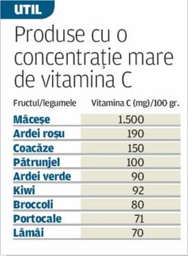 "Cea mai mare cantitate de vitamina C o au macesele. Si visinele sau merele au o concentratie ridicata. Legumele au si ele o concentratie mai mare, dar este de dorit sa fie consumate in stare cruda si cat mai verzi. In timpul iernii, un aport important de vitamina C il au muraturile", mai spune Julieta Cristescu. Mai putin cunoscut, ardeiul gras are si el o concentratie ridicata de acid ascorbic. In timpul verii, fructele de padure pot fi o alegere mult mai buna decat lamaile.