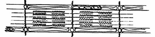Fig. 3 - Componenta a unei miofibrile. Reprezentarea grafica prezinta filamente dipuse in forma de matrice in secțiune longitudinala cu structuri adiacente (sursa: Voyle, 1974)