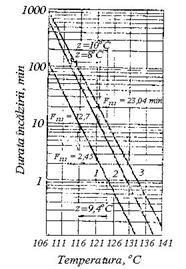 Conducerea corecta a procesului de sterilizare trebuie sa realizeze echilibrul optim intre timp si temperatura, tinand seama de toti factorii care contribuie la sterilizarea produ-sului: natura materiei prime, reactia mediului, vascozitatea, gradul de infectare etc. Pentru a intelege notiunea de valoare de sterilizare a fost ales un microorganism de referinta considerat ca foarte rezistent la caldura din gama sporilor patogeni si anume Clostridium botulinum. Distrugerea prin caldura a acestuia implica distrugerea tuturor celorlalte categorii de spori mai putin rezistenti. Ca urmare, valoarea de sterilizare a unui tratament termic este reprezentata prin gradul de distrugere a sporilor de Clostridium botulinum supusi tratamentului respectiv. Luand ca referinta temperatura de 121,1oC (distrugerea completa se obtine prin incalzirea timp de 1 minut la 121,1oC sau timp de 10 minute la 111,1oC) se poate spune ca valoarea de sterilizare a tratamentului termic care consta in aplicarea temperaturii de 121,1oC timp de 1 minut este 1; la 111,1oC valoarea de sterilizare va fi de 10 ori mai mica, adica 0,1; la 131,1oC se constata ca o zecime de minut este suficienta, valoarea de sterilizare a tratamentului aplicat fiind 10. |