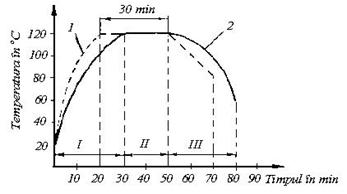 Figura 3 - Curba de termopenetratie: 1 - variatia temperaturii in autoclav; 2 - variatia temperaturii in centrul geometric al recipientului. |