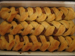 Foaia de aluat o imparti in 3 parti. Iei o parte si pe lungime asezi merele in mijloc. Pe lateral