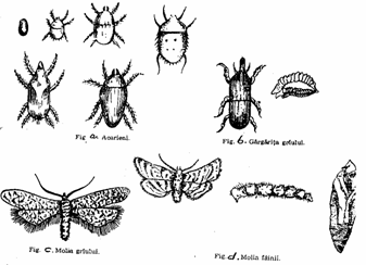 moliile, dintre care cele mai cunoscute sunt: molia graului (fig.c), molia cerealelor, fluturele morilor si molia fainii (fig.d); cele mai mari pagube sunt produse de catre molii in faza de omida, cand consuma cu lacomie boabele, crupele sau faina.