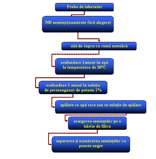 Obs. In solutia de spalare se scufunda pentru 20-30 de secunde. Timpul se mareste la 1 minut in functie de starea solutiei de spalare, care pe masura folosirii se coloreaza in galben sau in culoarea permanganatului de potasiu. Apoi se separa semintele cu puncte negre, cu aspectul unor dopusoare, avand diametrul de 0,5mm. Separarea semintelor se face imediat dupa spalare, pentru ca punctele negre sa nu se decoloreze din moment ce nu mai sunt sub influenta permanganatului de potasiu.