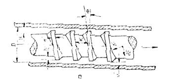In afara de curgerea longitudinala pe axa Oy exista si o curgere transversala pe axa Ox, precum si scaparile peste axa spirelor. Considerand geometria snecului constanta pe toata lungimea si corpul snecului apropiat de varful spirelor,in sectiunea de compresiune maxima,curgerea neta se poate calcula cu relatiile: