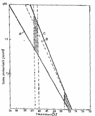De regula, regimul de pasteurizare se realizeaza la o combinatie temperatura/timp necesara pentru a creste eficienta distrugerii microorganismelor, in raport cu patogenii cei mai termorezistenti, si anume Mycobacterium tuberculosis hominis, dar in acelasi timp se urmareste minimizarea efectelor tratamentului termic asupra calitatilor senzoriale si nutritive ale laptelui. Relatia timp/temperatura necesara realizarii efectului de distrugere a lui Mycobacterium tuberculosis hominis, transpusa in cordonata semilogaritmice in diagrama Dahlberg, este data de curba A.Relatia timp/temperatura in care se percep modificari senzoriale in laptele pasteurizat, in aceleasi coordonate, este data de curba C.In consecinta, orice combinatie timp/temperatura ce corespunde unui regim optim de pasteurizare trebuie sa fie situat intre cele doua drepte limita (A si C), adica curba B din diagrama Dahlberg.(fig.1)