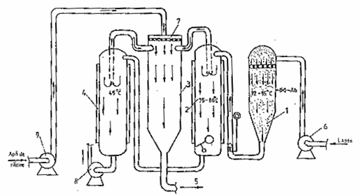 Pasteurizarea sub vid (vacreatia). Acest sistem a fost pus la punct de firma Cherry-Burell din S.U.A.. Instalatia este numita vacreator si este folosita atat pentru pasteurizare-dezodorizarea laptelui cat si pentru cea a smantanii. Instalatia este formata din trei compartimente care functioneaza sub vid si anume: compartimentul 1 in care se realizeaza pasteurizarea prin injectiea laptelui trimis cu pompa 6 in abur (92950C)si o diluare partiala a laptelui.Vidul realizat in acest compartiment este de 500-600 mmHg; in compartimentul 2 se realizeaza o racire partiala a laptelui cu apa circulara prin mantaua compartimentului, vaporii de apa si substante de miros volatile fiind conduse in compartimentul 3 aflat si el sub depresiune prin distribuitorul7.In comparimentul 2, vidul este de 340 mmHg, ceea ce corespunde la o temperatura de 75800C. Laptele din compartimentul 2 este adus in compartimentul 4 care lucreaza la un vid de 90mmHg si la temperatura de 450C, compartiment care si el este racit in manta. In acest compartiment se elimina restul de vapori de apa si substante de miros volatile care sunt si ele conduse in compartimentul 3. In compartimentul 3, vaporii de apa si substante sunt preluate de apa trimisa cu pompa 9 si evacuate din sistem cu ajutorul unei pompe de vid cu inel de apa.Laptele pasteurizat, depozitat din compartimentul 4, este evacuat cu pompa 8. Evacuarea gazelor necondensate si a vaporilor de apa se face prin conducta 5.( fig 2)