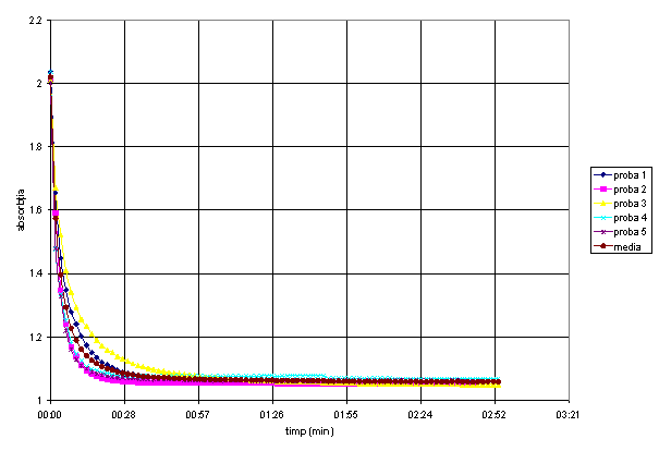 Variatia in timp a absortiei, pentru cele cinci probe, precum si media curbelor rezultatesunt redate in graficul 1.